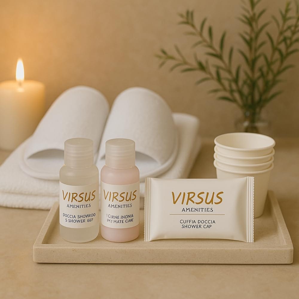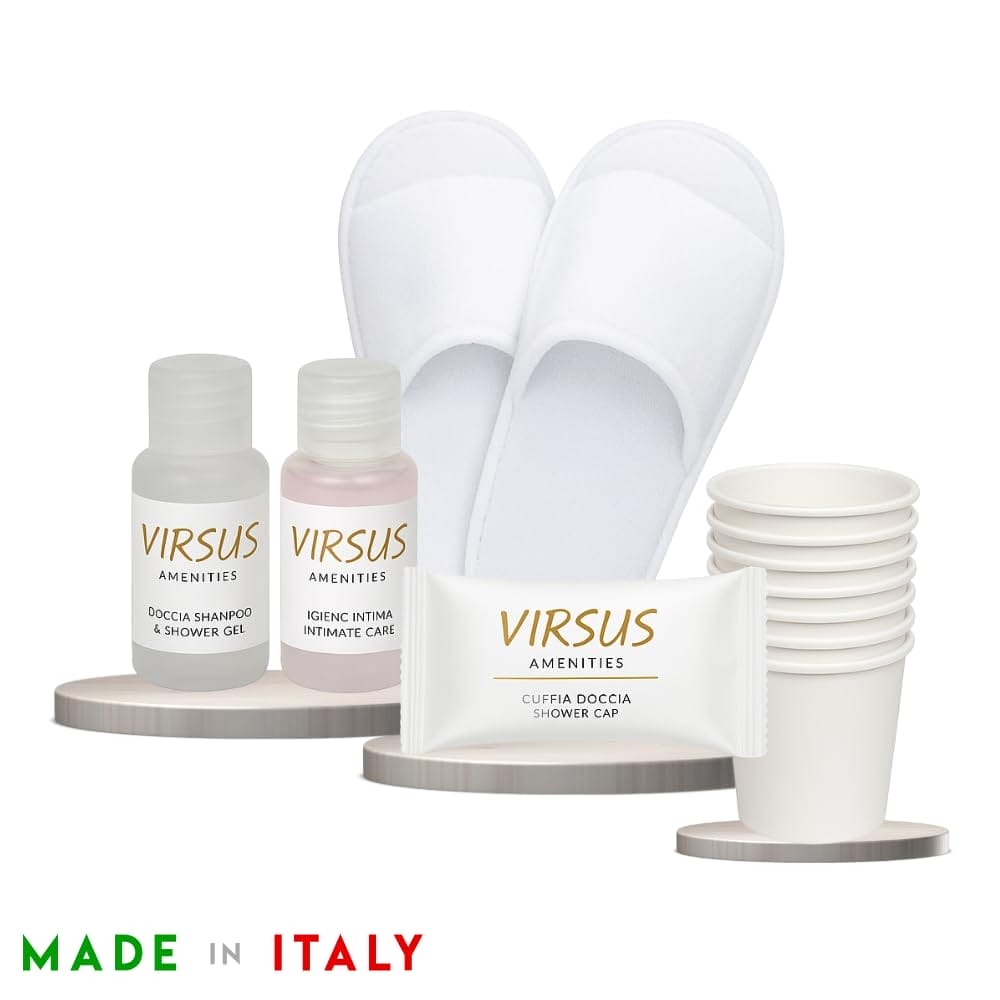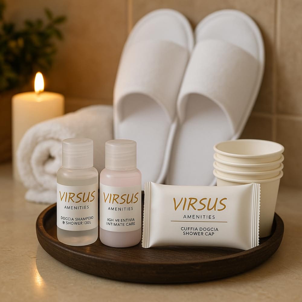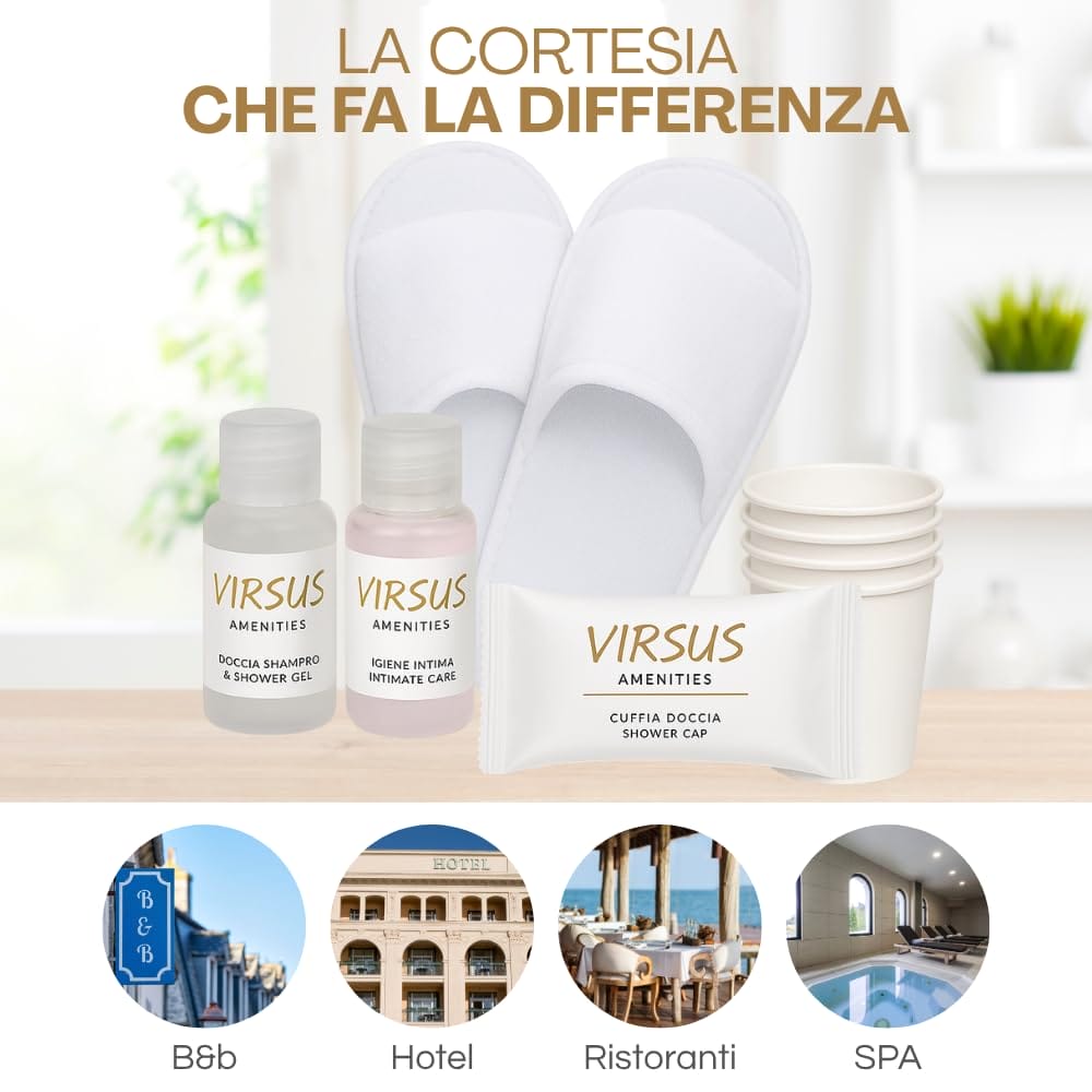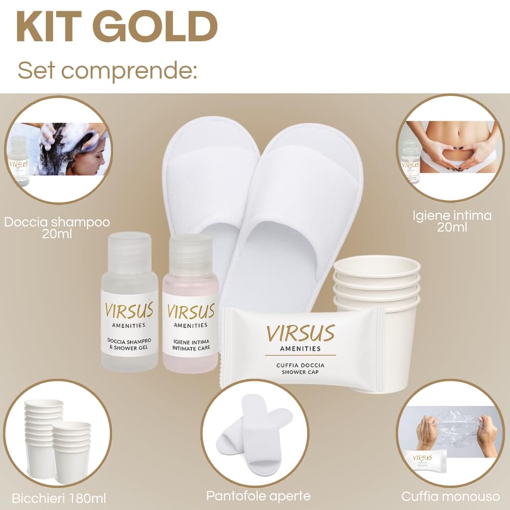 Kit Cortesia GOLD. Ogni Kit comprende 220 prodotti: 50 Flaconi per igiene intima 20ml, 50 Flaconi di doccia shampoo 20ml, 50 cuffie monouso, 50 bicchieri in carta Imbustati, 20 paia di pantofole aperte