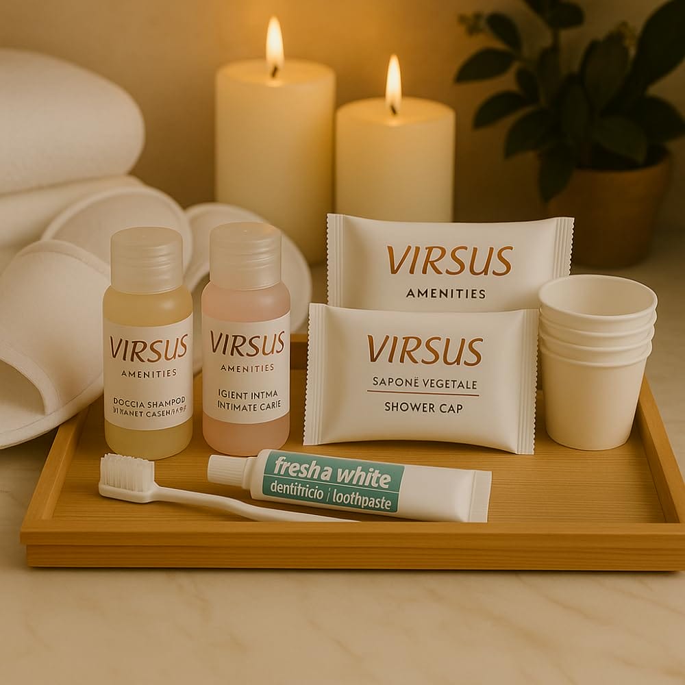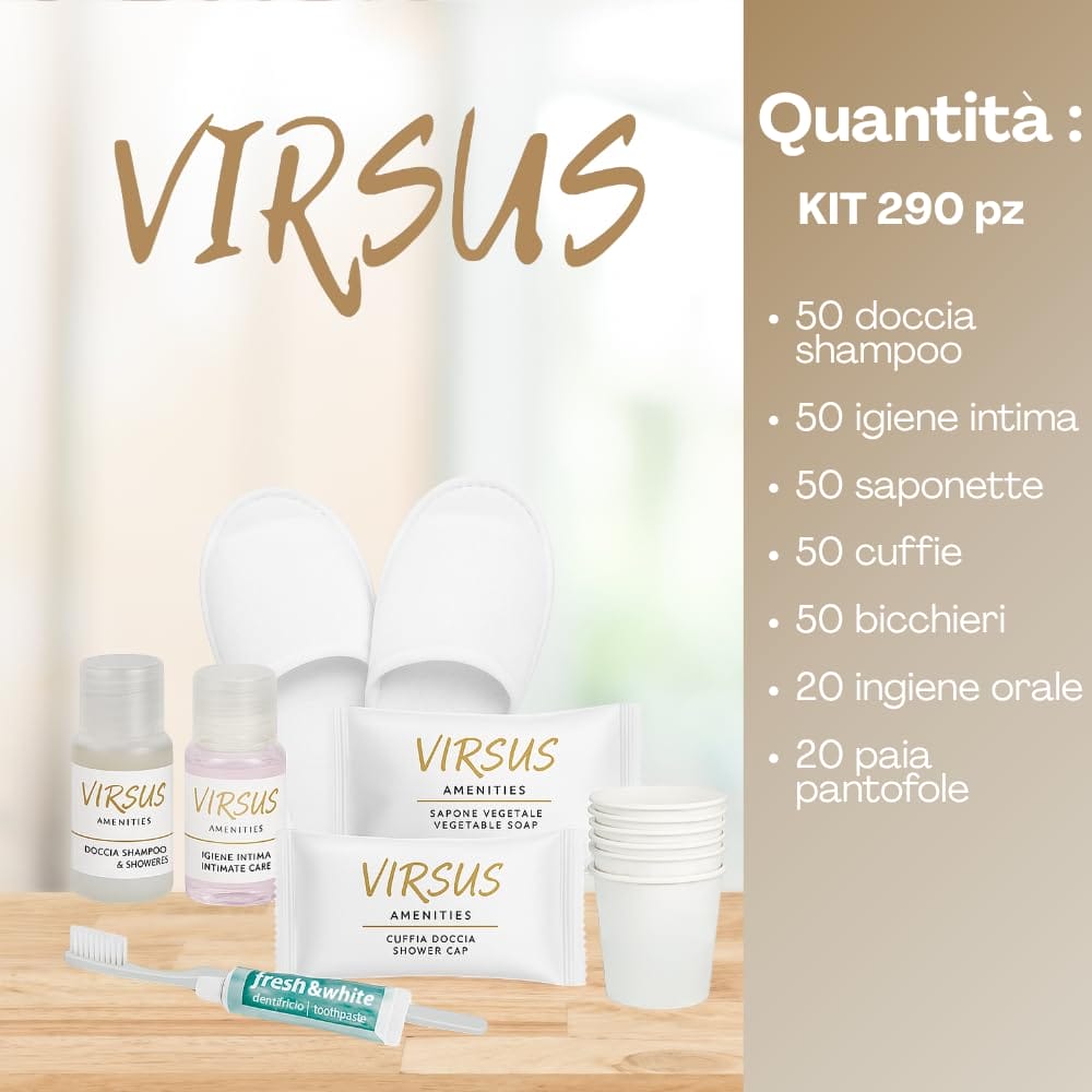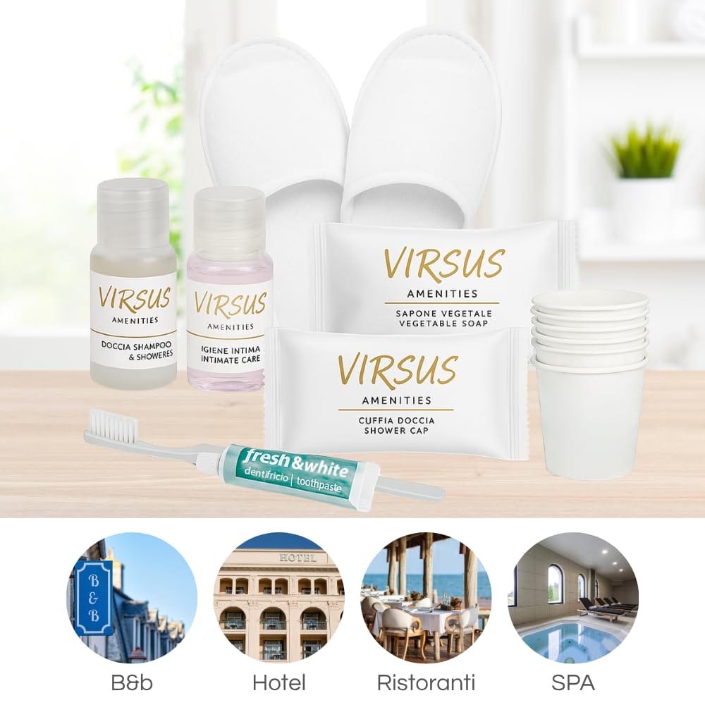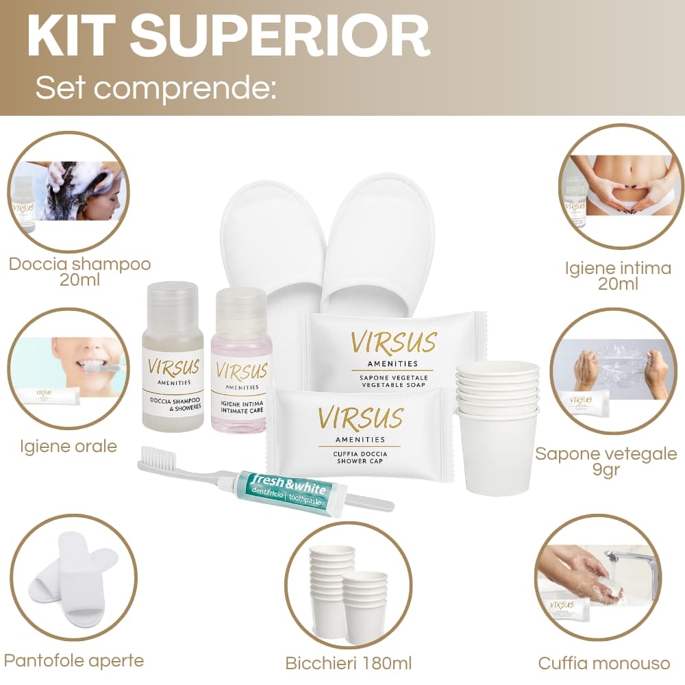 Kit Cortesia SUPERIOR composta da 50 Flaconi Igiene intima 20ml, 50 Flaconi Doccia Shampoo 20ml, 50 cuffie, 50 Saponette, 50 Bicchieri Imbustati, 20 Paia Pantofole e 20 Set Denti