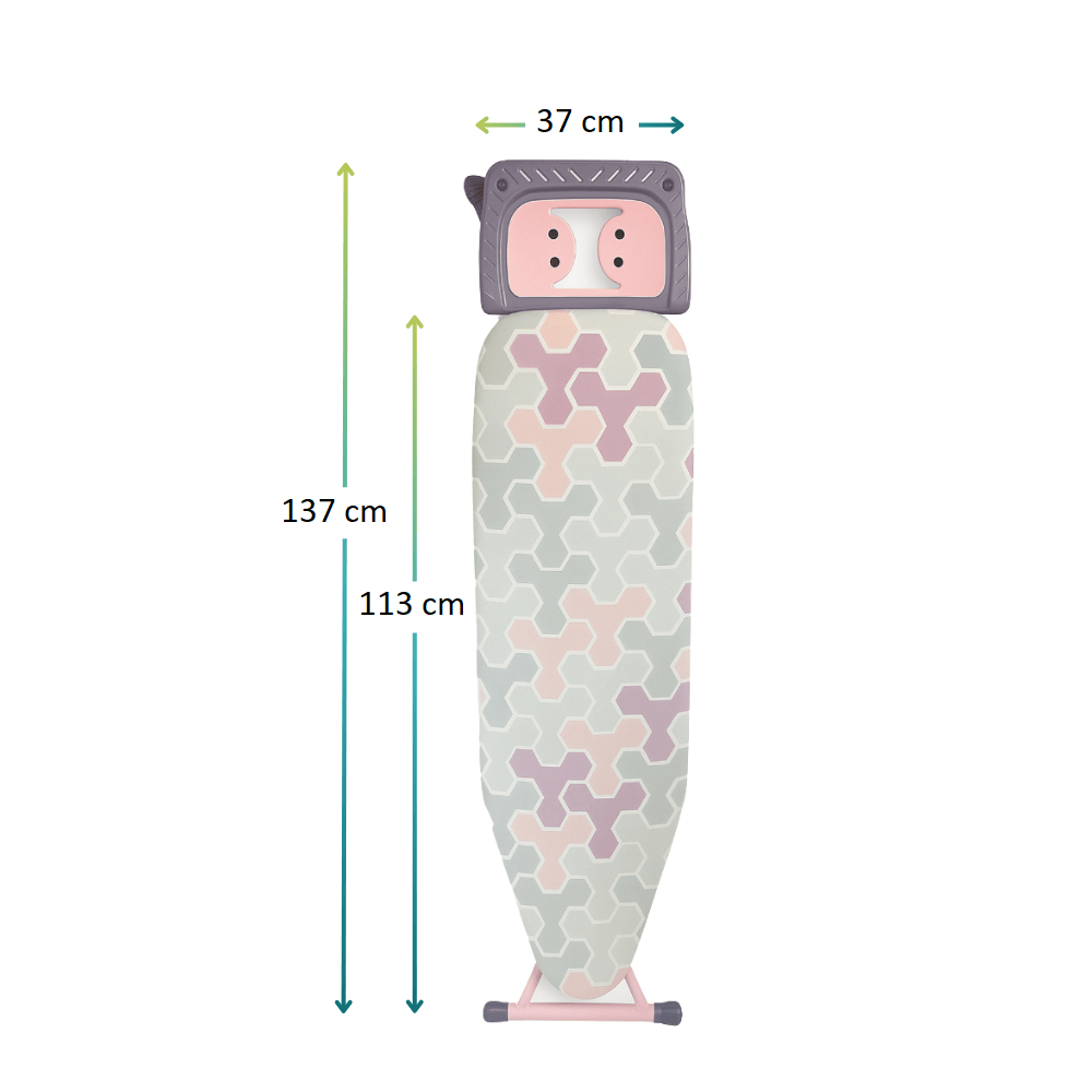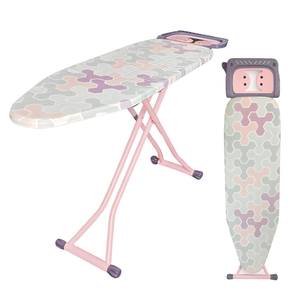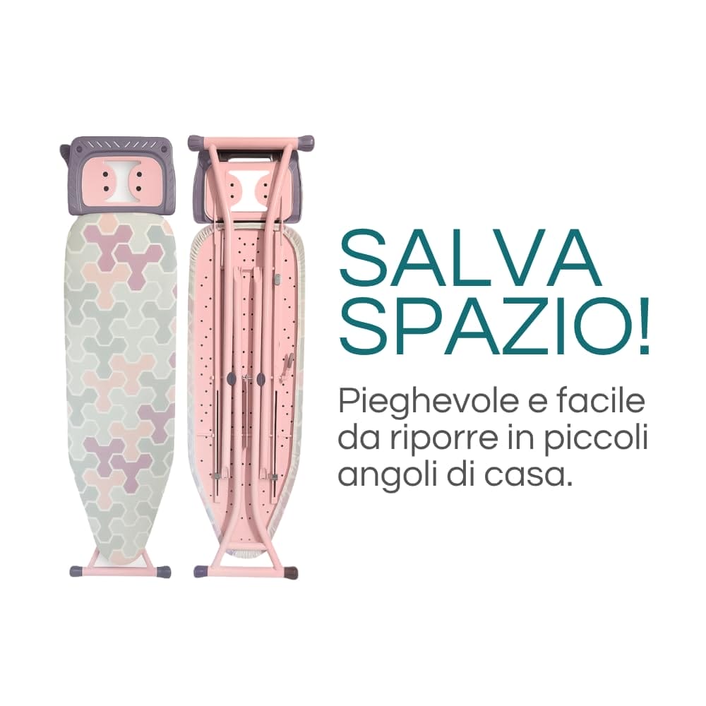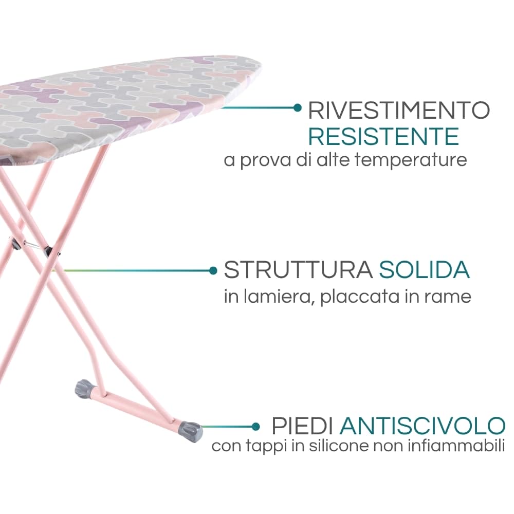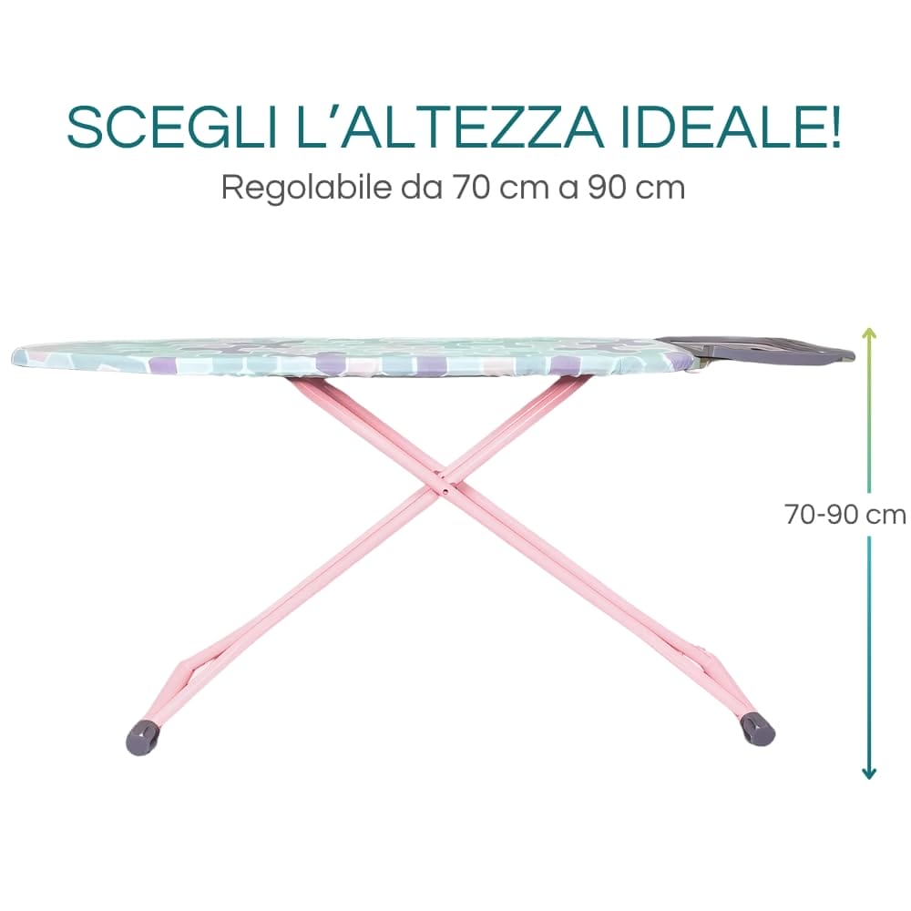 Asse da stiro pieghevole con altezza regolabile - Misura 137x37 cm - Tavola da stiro con poggia ferro da stiro e copriasse - Colore lilla e rosa