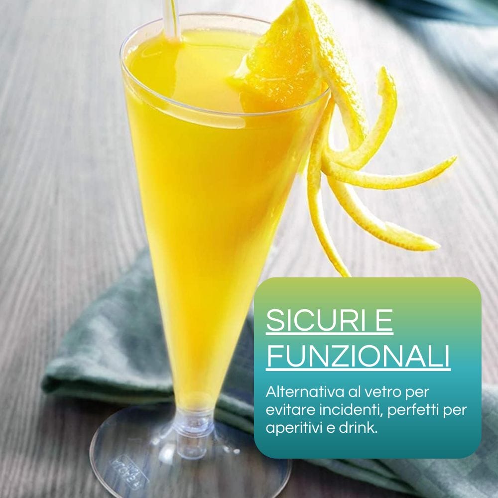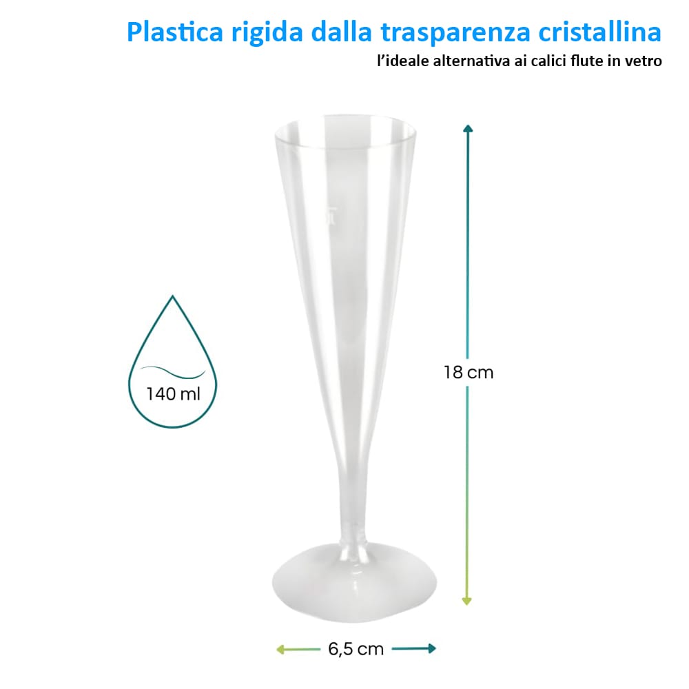 Il bicchiere Flute in plastica monouso trasparente da 140 ml, sono dotati dal gambo sottile rimovibile e dalla forma allungata ideale per la degustazione di spumante o per accompagnare le tue feste senza rinunciare alla comodità di un prodotto monouso che preservi la sua eleganza. Dal design semplice ed elegante, rigido e liscio al tatto, sono comunemente utilizzati per il consumo di bevande rinfrescanti come prosecco o spumante ma anche per degustarzione di sorbetti o cocktail. Sono disponibili in comode confezioni da 20 pezzi comprensivi di gambi. Disponibili in quantitativi da:- 20 Calici comprensivi di 20 gambi;