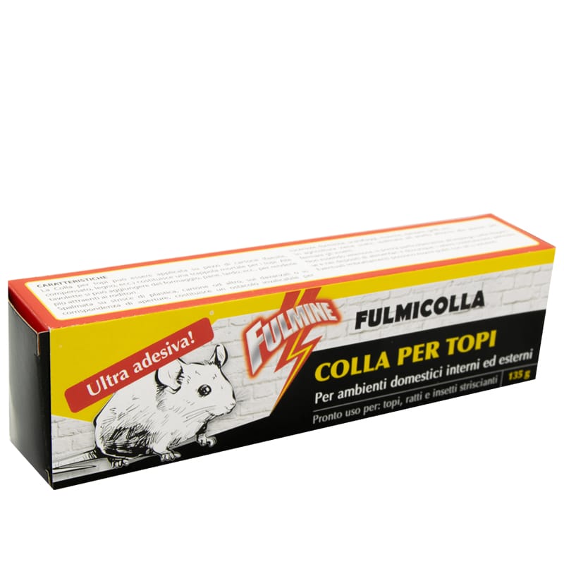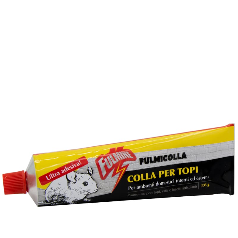 La colla per topi Fulmine costituisce una trappola mortale per topi o insetti. Essa, si presenta inodore e incolore ed è adtta per topilino domestico, ratto grigio, ratto nero, ed insetti vari. Questa colla Ultra adesiva è racchiusa in un pratico tubetto da 135 g ed è pronta all'utilizzo.