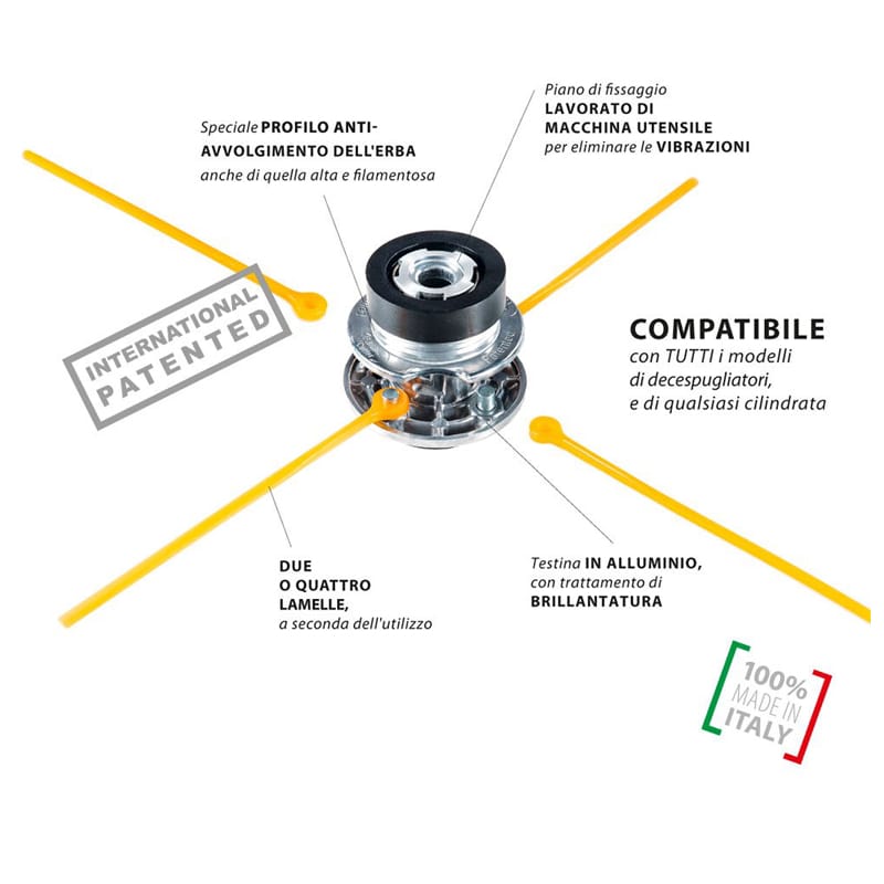 2 o 4 lamelle per ottenere 6 combinazioni diverse per affrontare le situazioni di taglio più differenziate. La scelta delle lamelle si effettua in base al tipo di lavoro da svolgere ed in base alla cilindrata del proprio decespugliatore.
