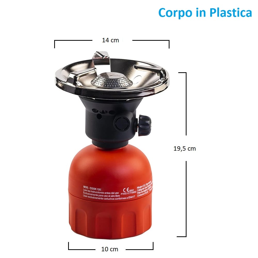 Fornellino da campeggio a Gas con cartuccia da 190 gr, accensione automatica piezo, regolatore di fiamma e piatto da 14 cm