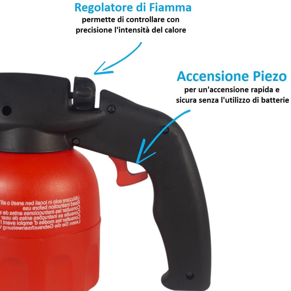 - REGOLATORE DI FIAMMA - sulla parte posteriore della pistola è presenta una comoda manopola per la regolazione continua della fiamma così da soddisfare ogni esigenza.