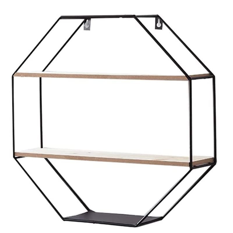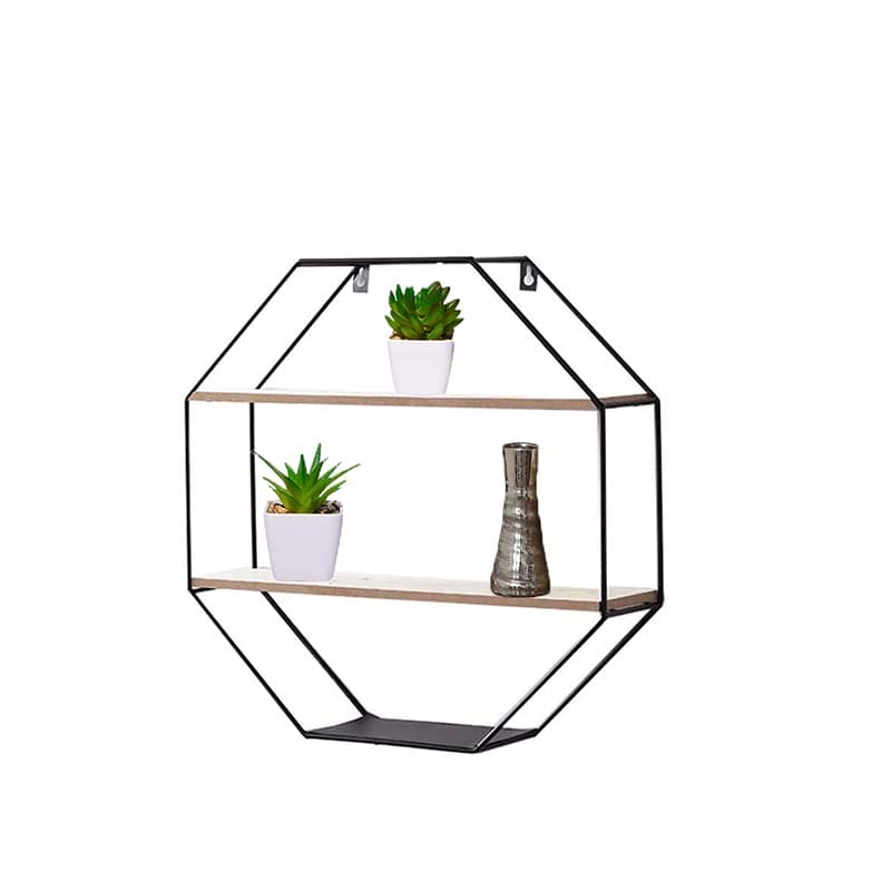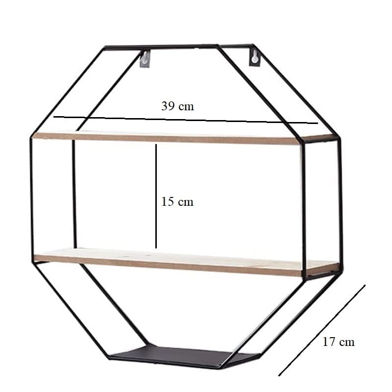 Mensola da Parete Ottagonale in Ferro e Legno Misura 40x40 cm e Spessore 10 cm - Mensola sospesa con 2 Ripiani, Design Industriale per vasi e oggetti