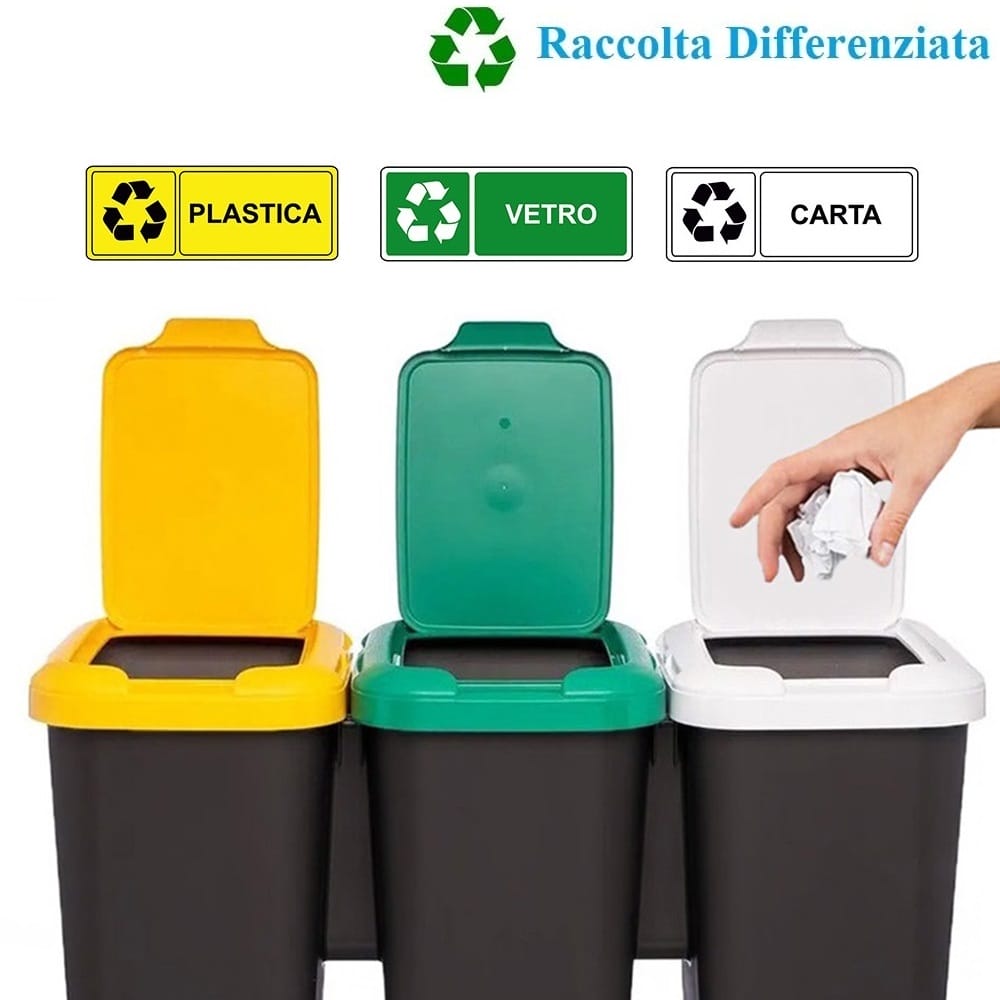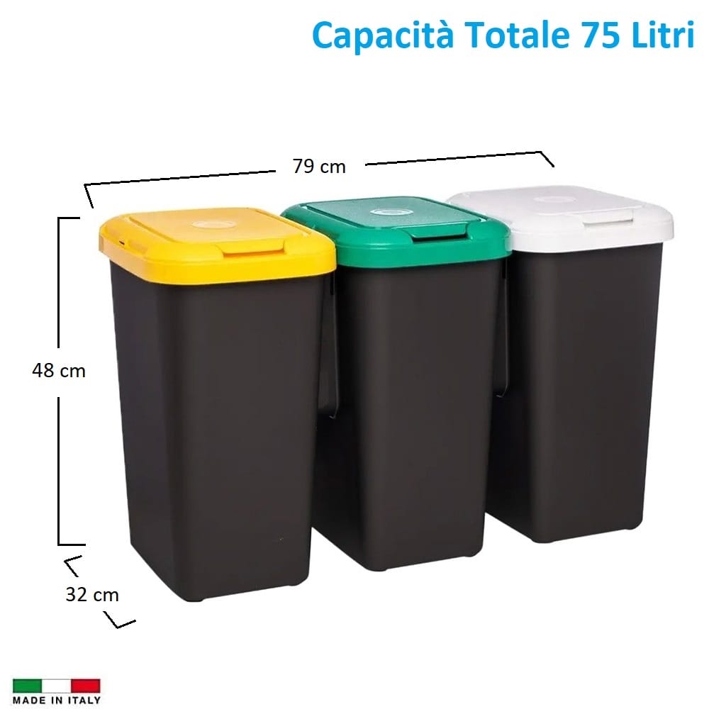 Pattumiera per la raccolta differenziata 3 scomparti - Capacità 75 litri e misura 79x32x48 cm - secchio per spazzatura con coperchi colore Bianco, Giallo e Verde