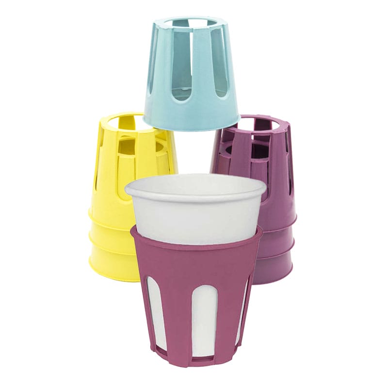 plastica molto resistente; la confezione contiene 8 porta bicchieri di colorazioni differenti. Adatti per bicchieri monouso in plastica e in cartone.