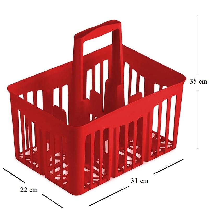 Un cestello portabottiglie di colore Rosso, misura 32x22x35 cm, ideale per trasportare comodamente fino a 6 bottiglie di acqua. Il prodotto è indispensabile per riempire le bottiglie di acqua ad una sorgente o alla casa dell'acqua così da poterle trasportare con facilità e comodità.
