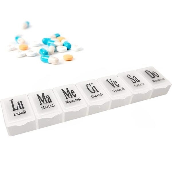 - 7 SCOMPARTI - il portapillole è costituito da 7 scomparti dalla forma quadrata, apribili dall'esterno verso l'interno. C'è scritto il giorno della settimana in ITALIANO su ogni scomparto, leggibile e chiaro così da facilitare l'uso del prodotto.