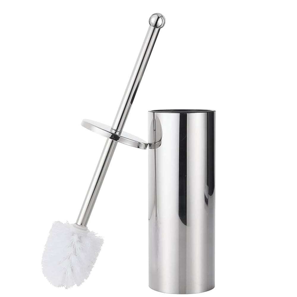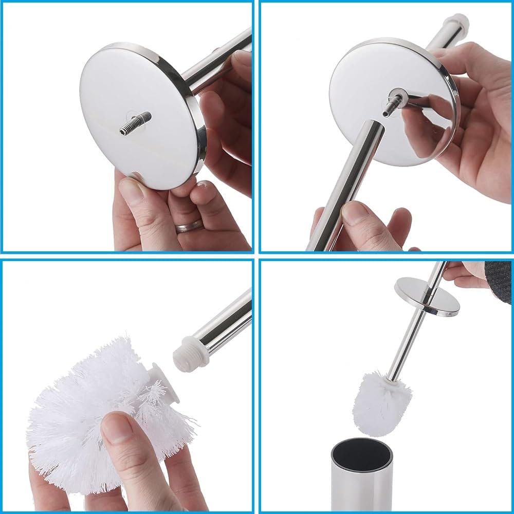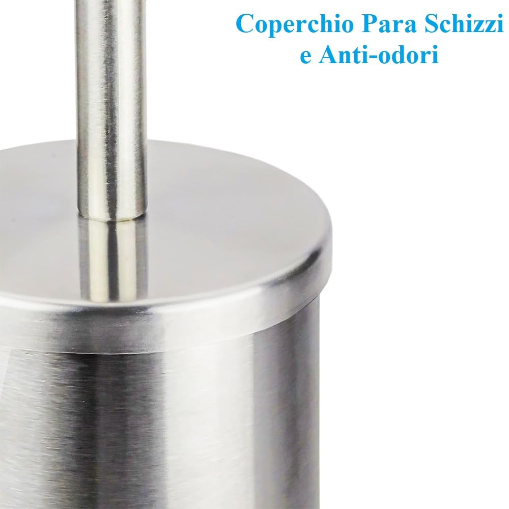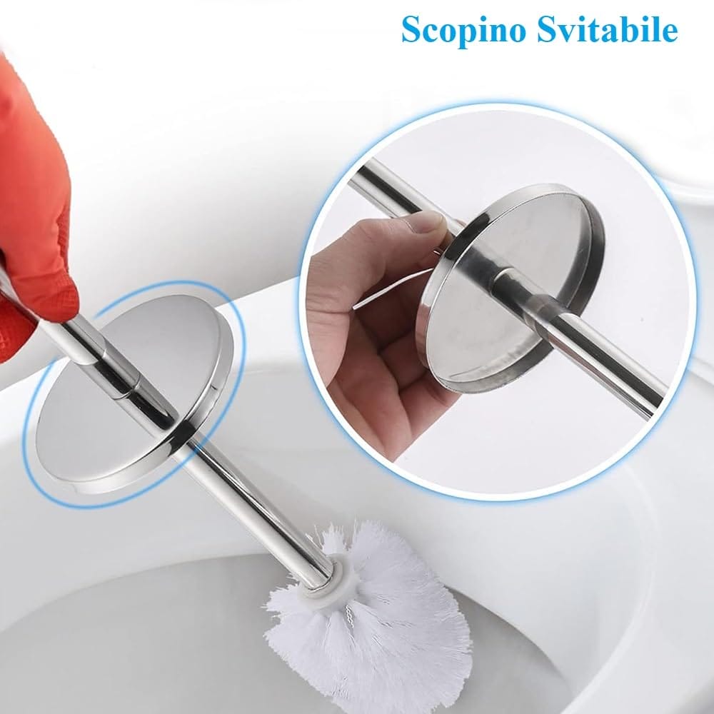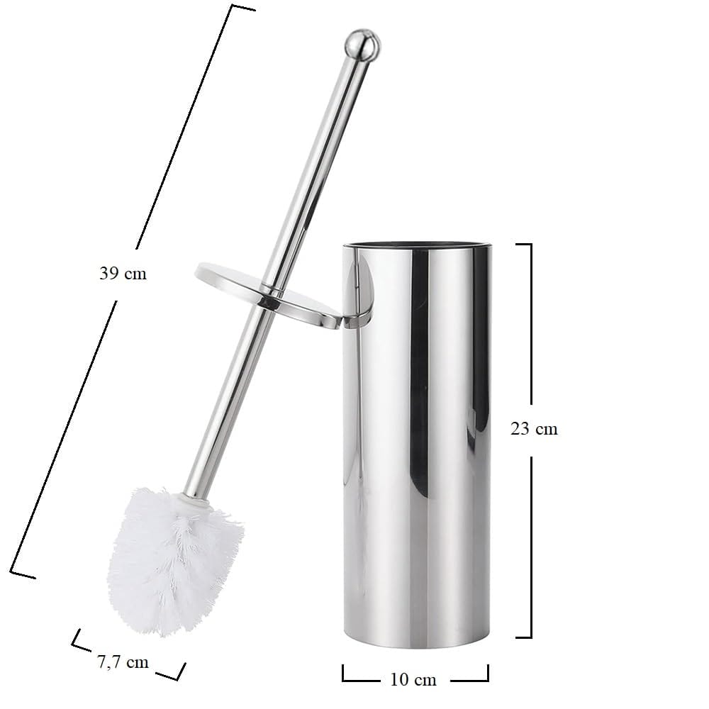 Portascopino con scopino per WC in acciaio inox, misura 10x39 cm, colore argento, scopettino con ciuffo svitabile sostituibile e manico antiscivolo