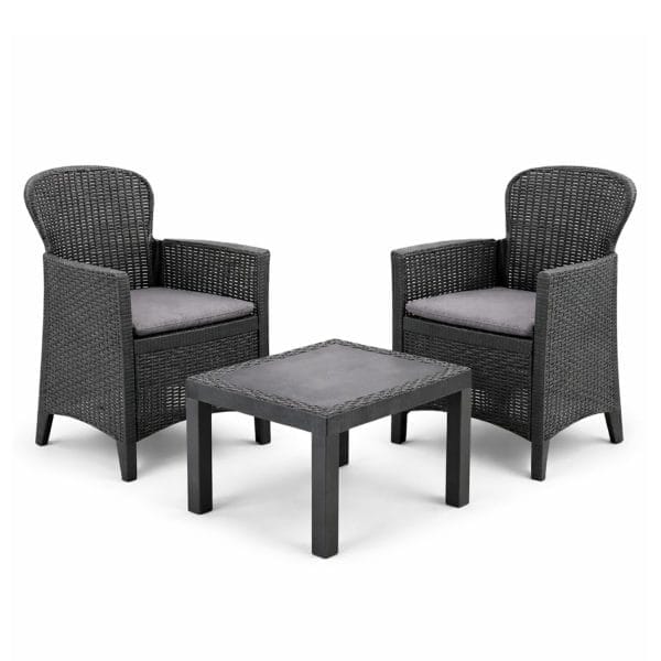 Salottino da Giardino in Rattan Intrecciato color Antracite con Cuscini, 2 Poltrone e Tavolino - Modello Akita