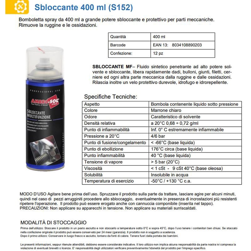 Sbloccante multifunzione lubrificante in bomboletta spray da 400ml