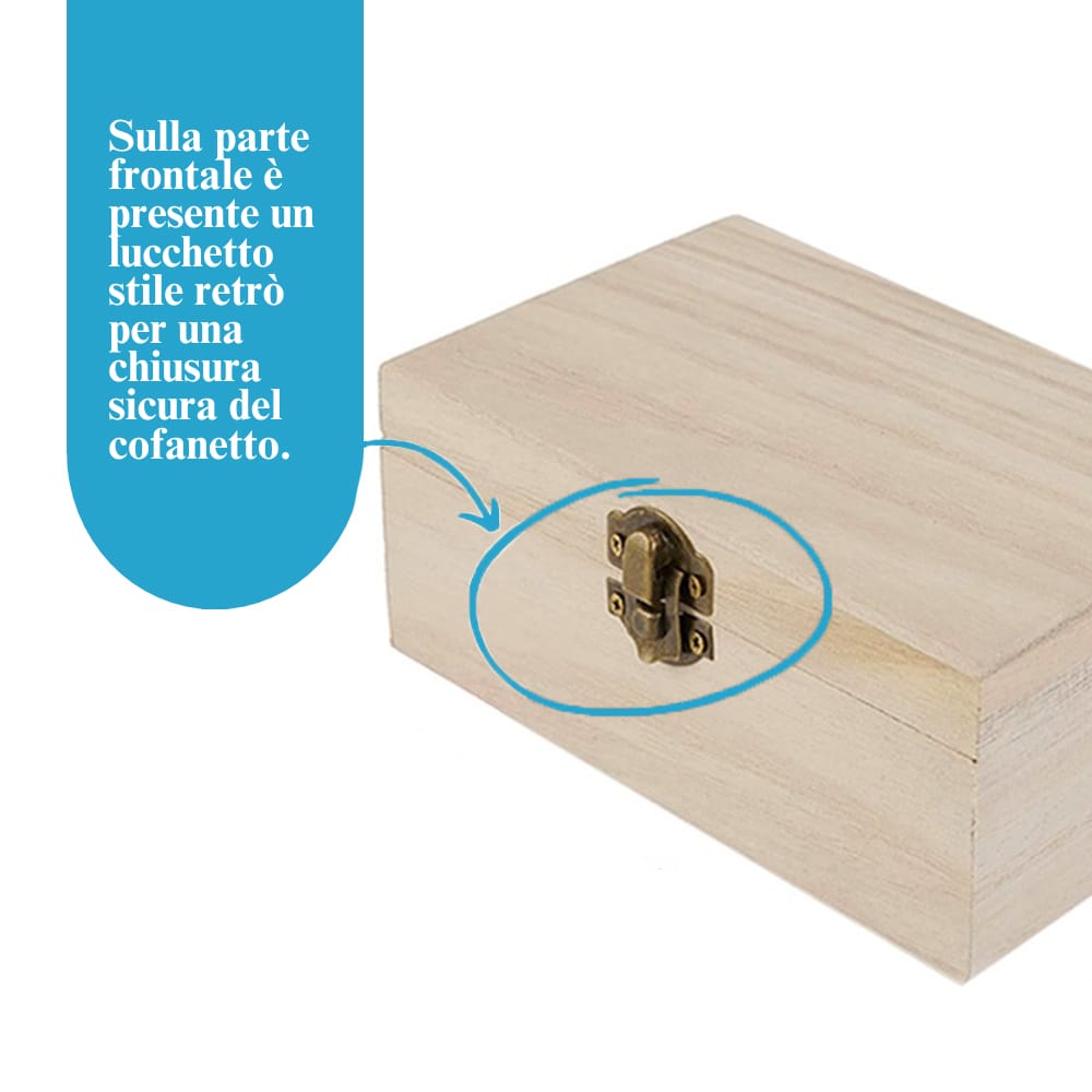 Ogni scatolina presenta un coperchio con apertura a scrigno dotato di robuste cerniere in metallo per la massima affidabilità d'utilizzo. Sulla parte frontale è presente un lucchetto stile retrò per una chiusura sicura del cofanetto.