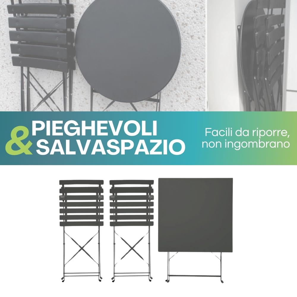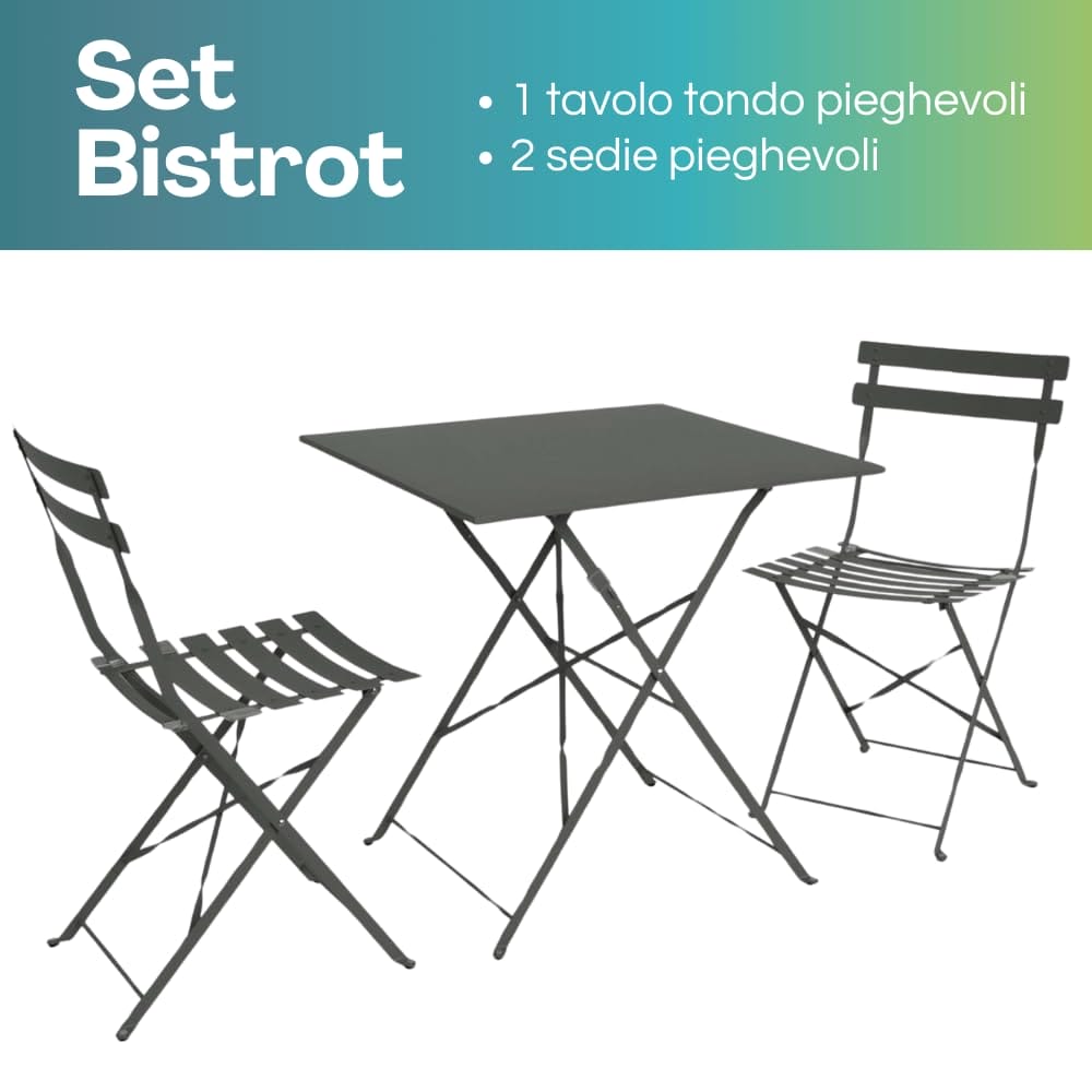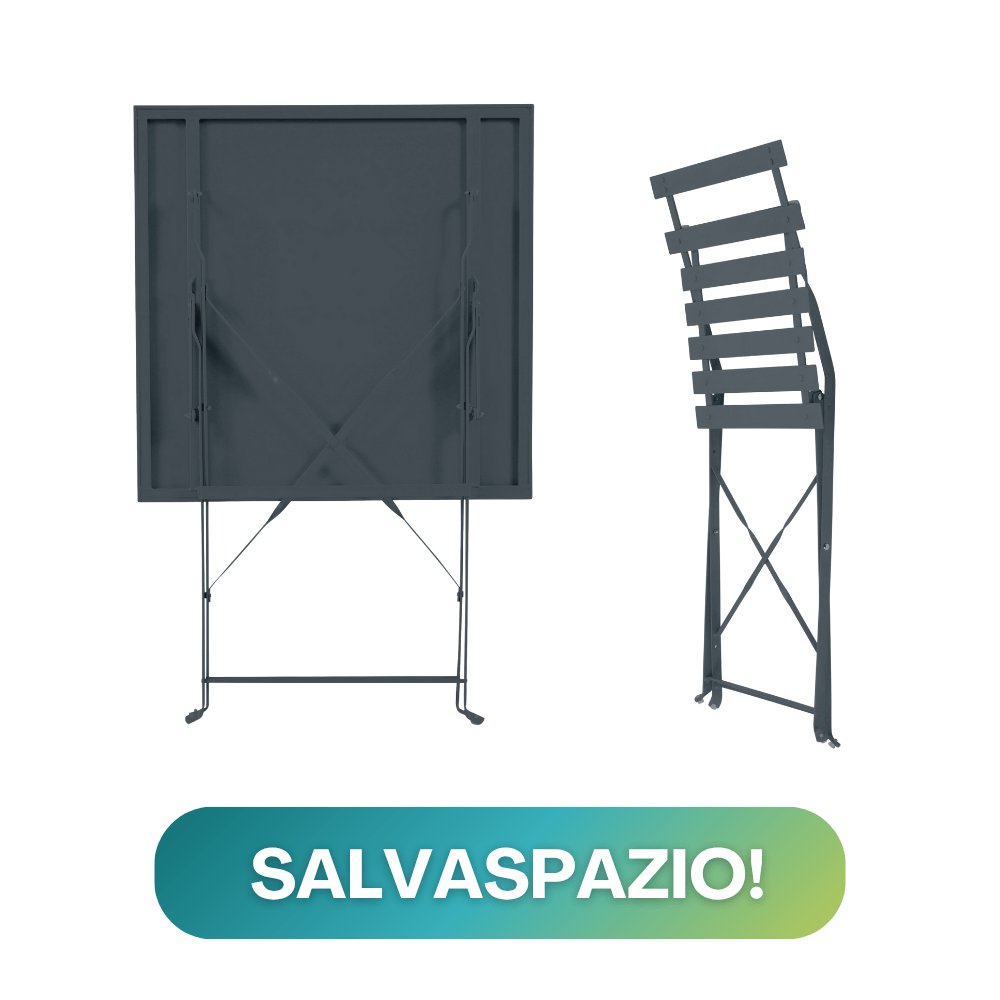 Realizzato in metallo di altissima qualità, il set bistrot è ideale per affrontare le intemperie quando collocato all’esterno. Ogni sedia presenta delle doghe curve per garantire il massimo confort di seduta.
