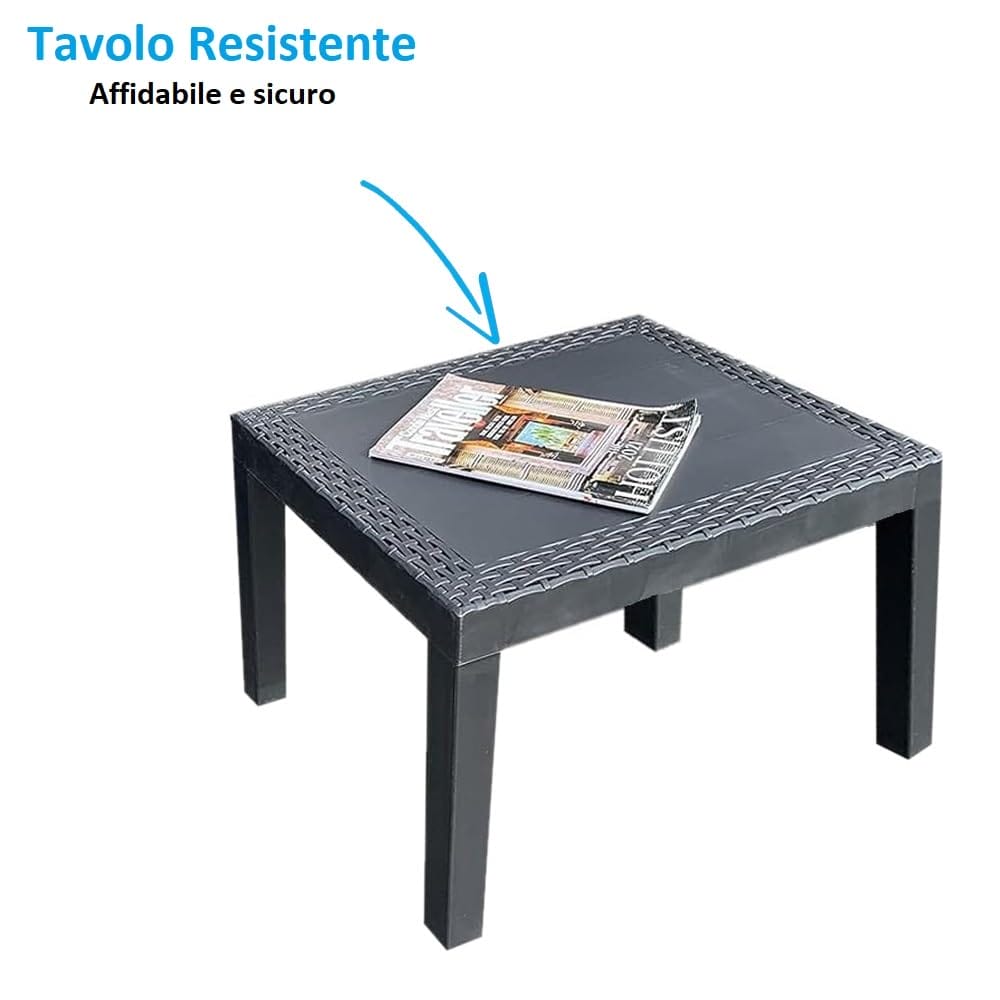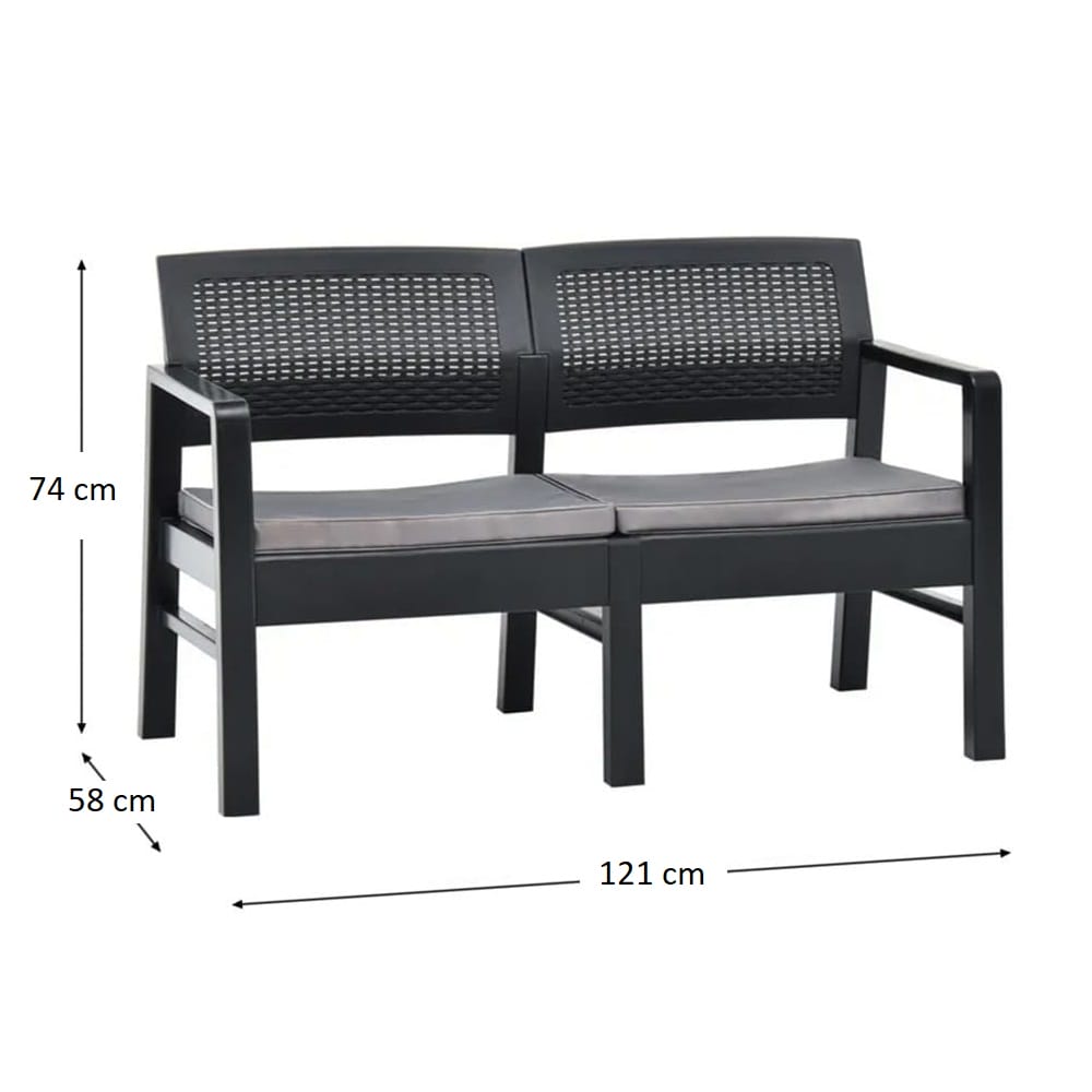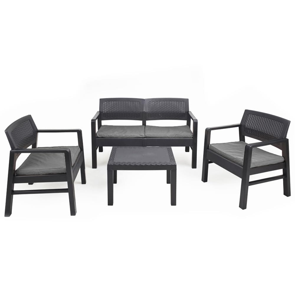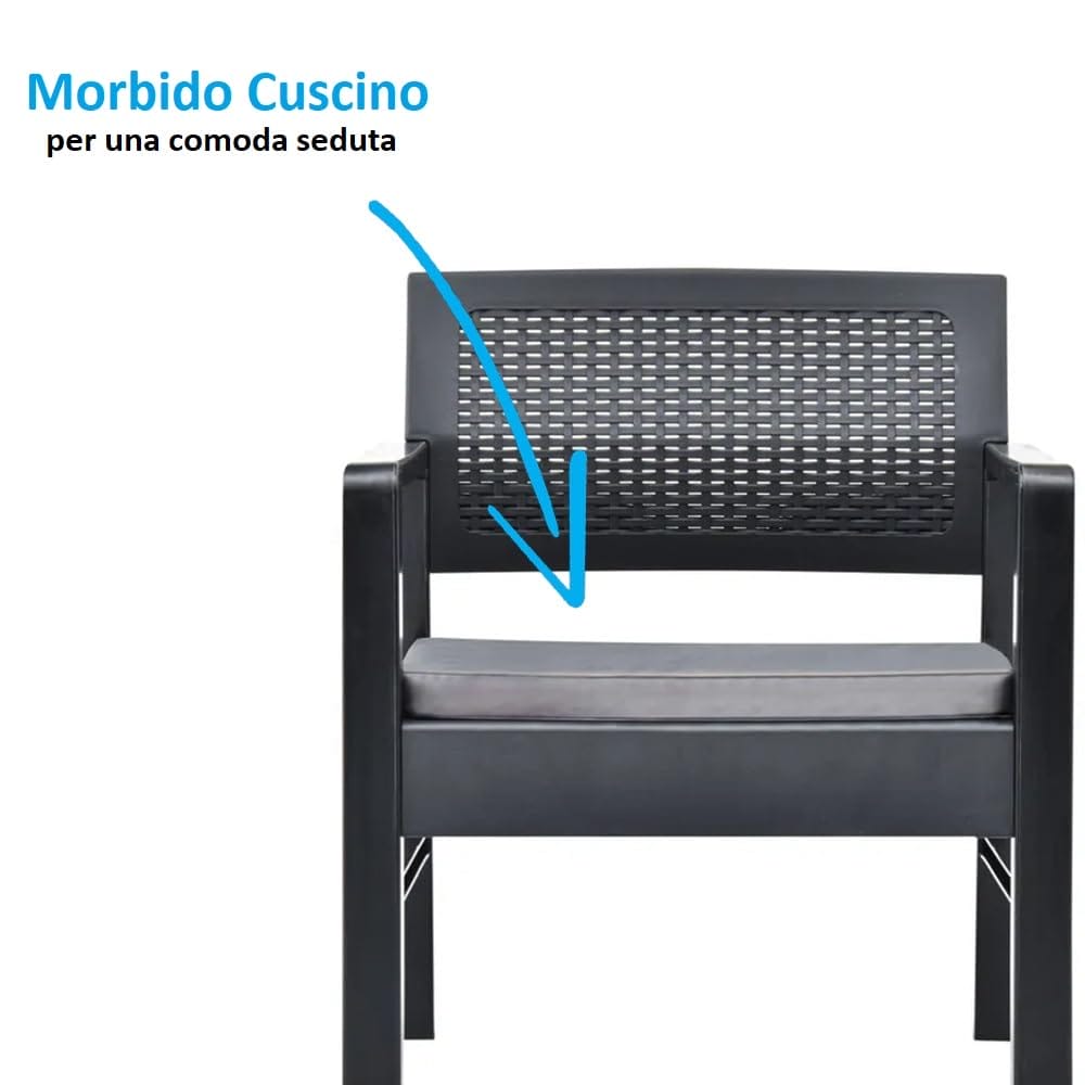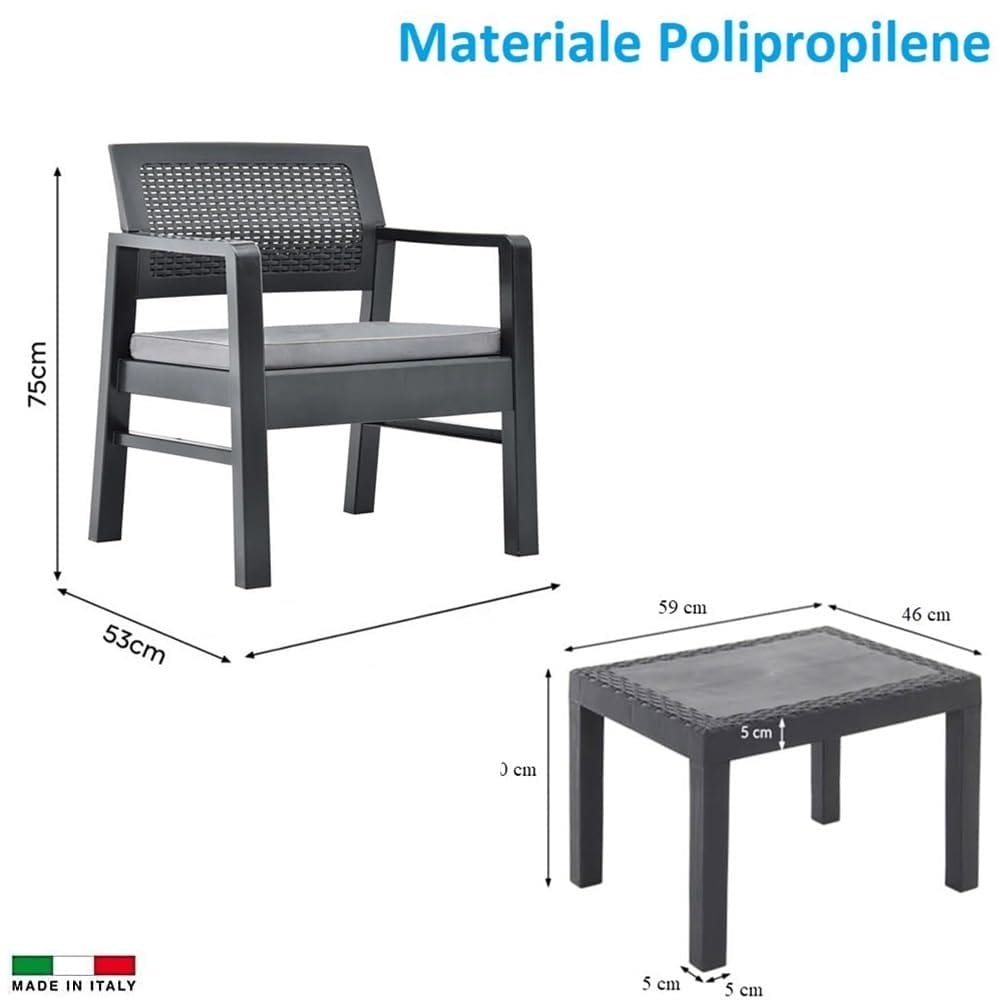 Set Salotto da Esterno 4 Posti in Polipropilene Antracite con Divano, 2 Poltrone, Tavolino e morbidi Cuscini per una morbida seduta