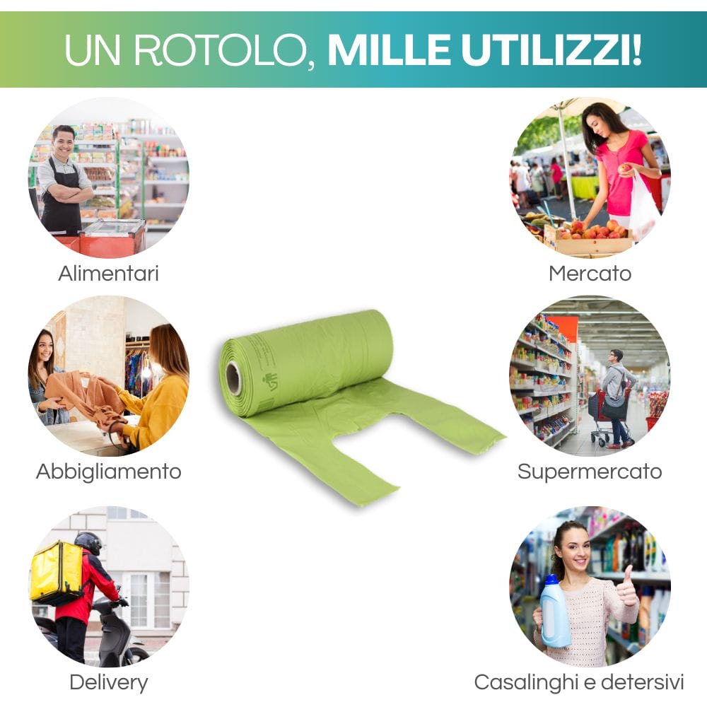 Queste shopper biodegradabili di colore verde, a rotoli, oltre ad essere indispensabili negli esercizi commerciali per riporre all'interno gli acquisti che i clienti effettuano, sono anche indispensabili nei comuni che hanno predisposto la raccolta della frazione organica dei rifiuti, che viene considerata valida solo se questi vengono raccolti nel sacchetto compostabile.