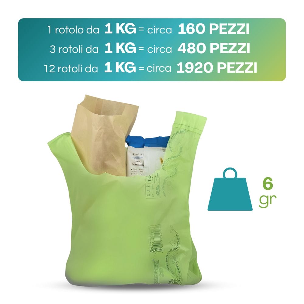 rotoli da 1kg (di circa 160 pezzi). Le shoppers sono biodegradabili e compostabili e sono ideali per tutti gli esercizi commerciali ma anche per raccogliere i rifiuti in abitazioni private o durante eventi pubblici o privati.