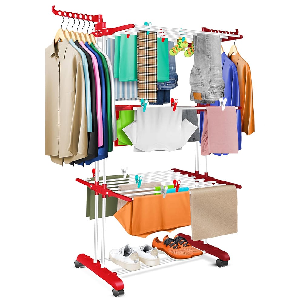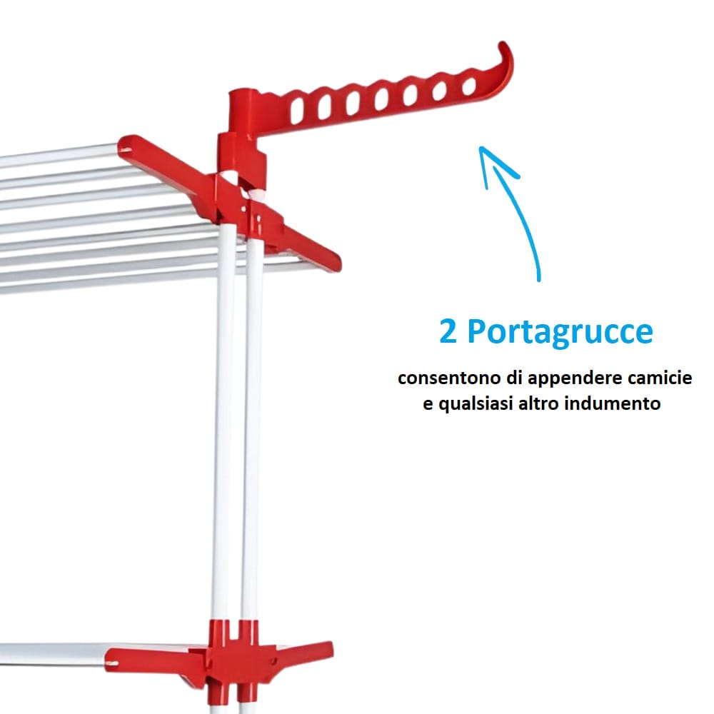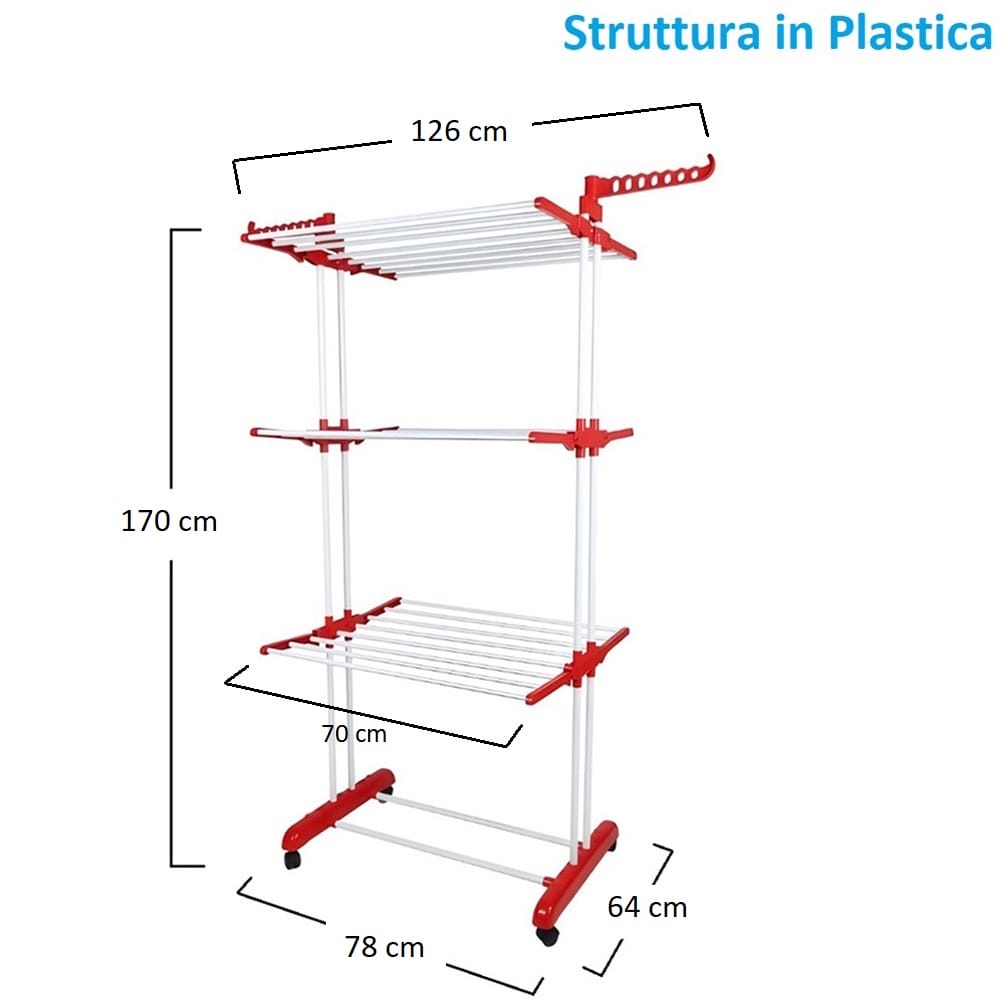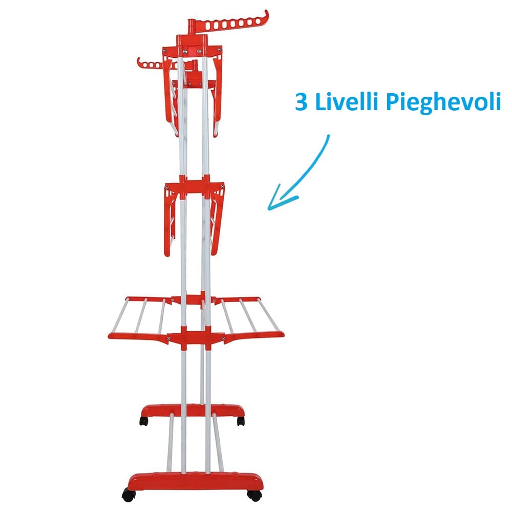 Stendibiancheria a colonna di colore rosso con 3 livelli e struttura pieghevole in plastica con spazio di stenditura pari a 30 Metri - Dimensioni 126x64x170 cm