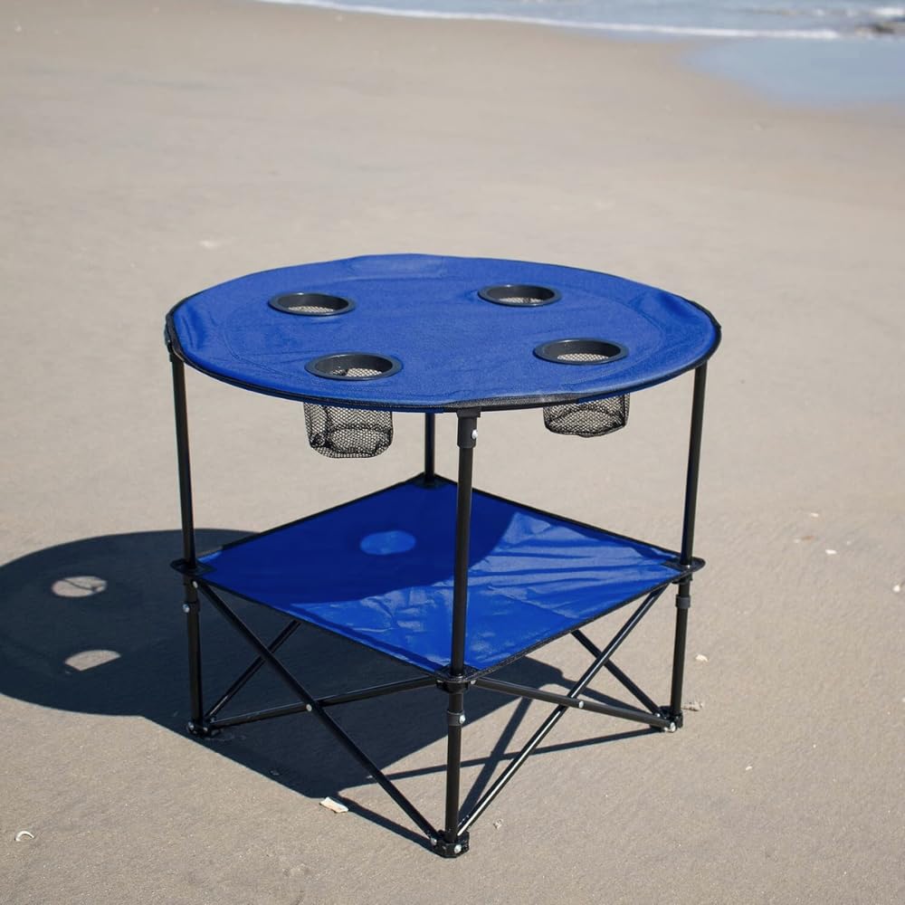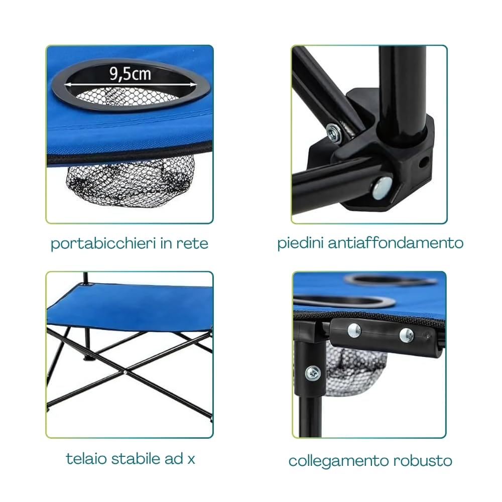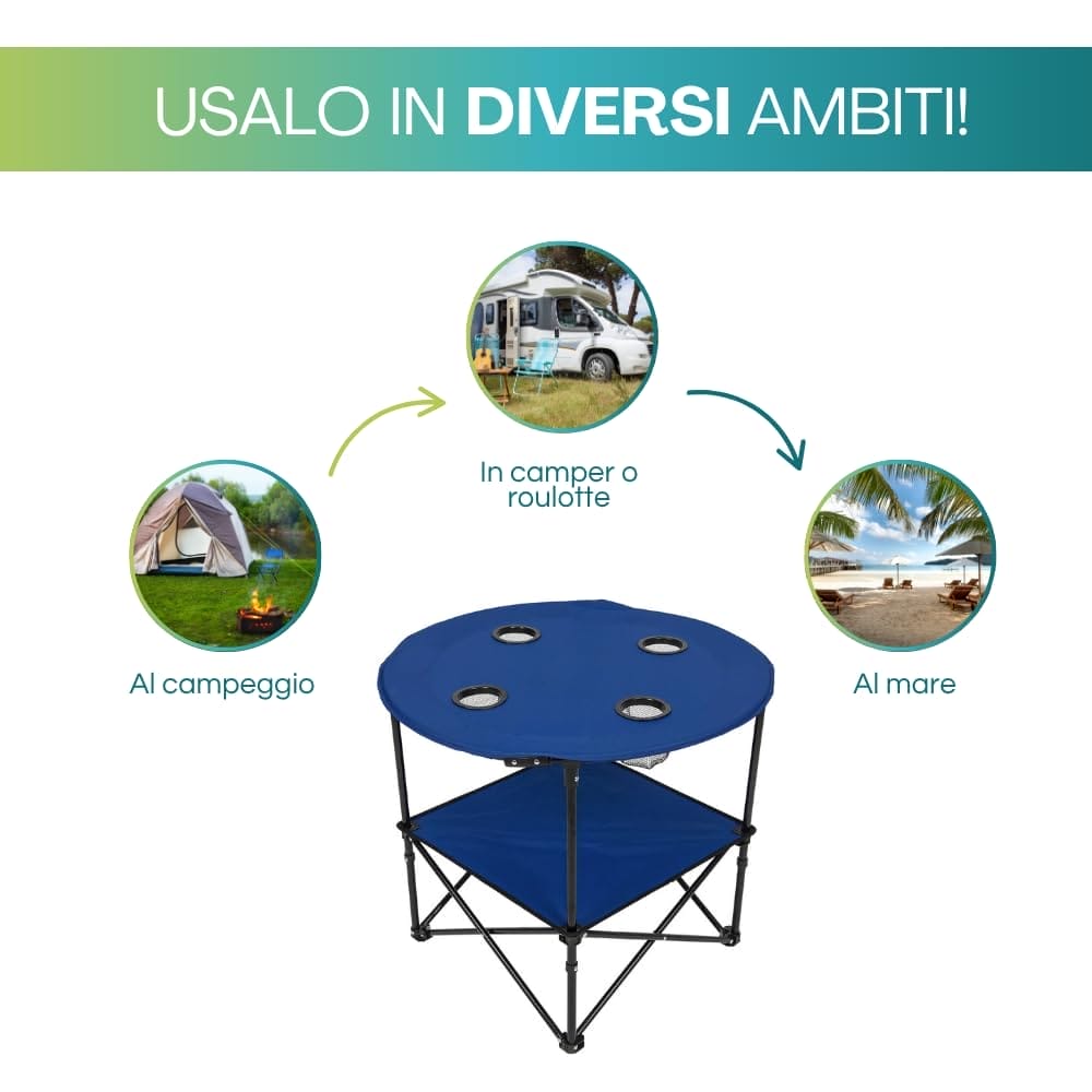 FUNZIONALE - crea un'area comoda e funzionale durante le tue gite, picnic o in spiaggia con il nostro tavolo da campeggio in tessuto. Presenta 4 comodi porta bicchieri rendendo il tavolino un prodotto versatile ed affidabile in ogni occasione.