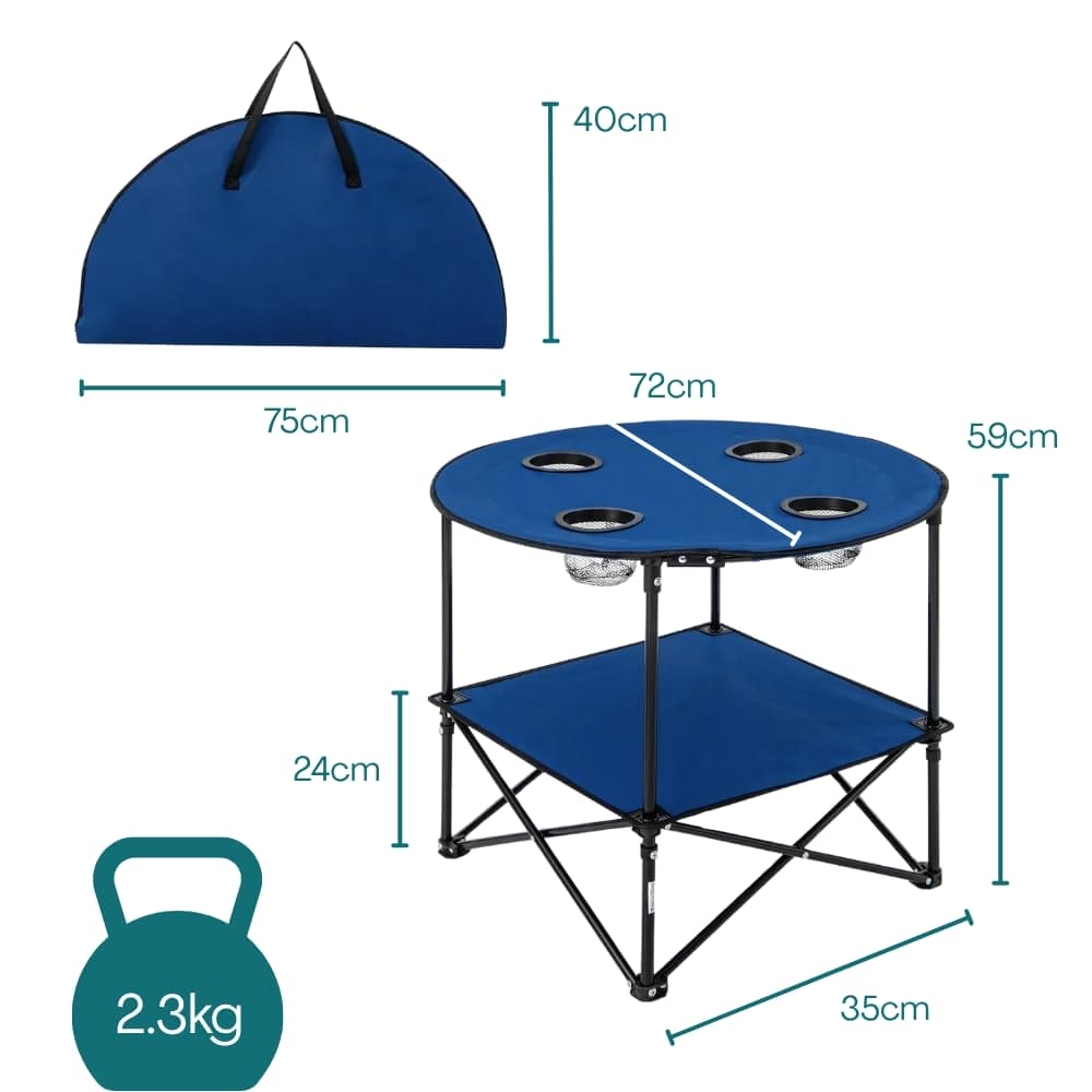 Tavolo rotondo in tessuto oxford 600D di alta qualità con misura aperto pari a 72x72x60 cm. Progettato per offrire un'area pratica e funzionale per i tuoi momenti all'aria aperta.