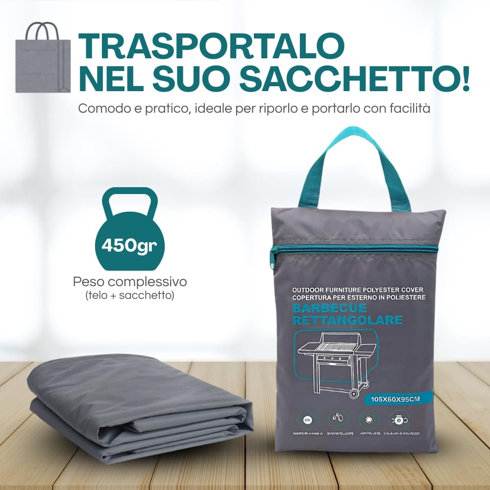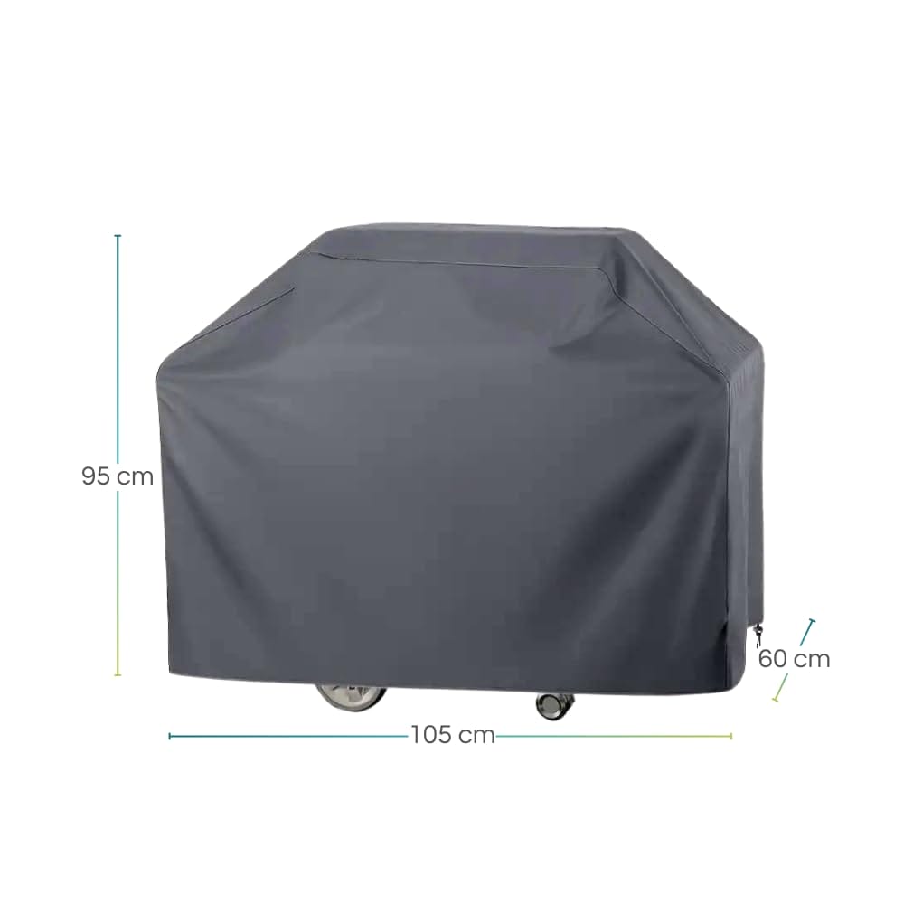 Telo protettivo per barbecue da giardino con dimensioni pari a 105x60x95 cm, realizzato con tessuto 210D impermeabile di alta qualità, il nostro telo protegge il tuo barbecue dall'umidità, dalla pioggia, dalla grandine e dai raggi UV, mantenendolo asciutti e protetti in qualsiasi condizione atmosferica.