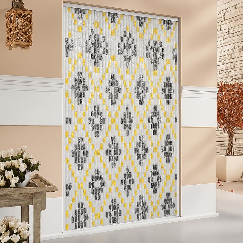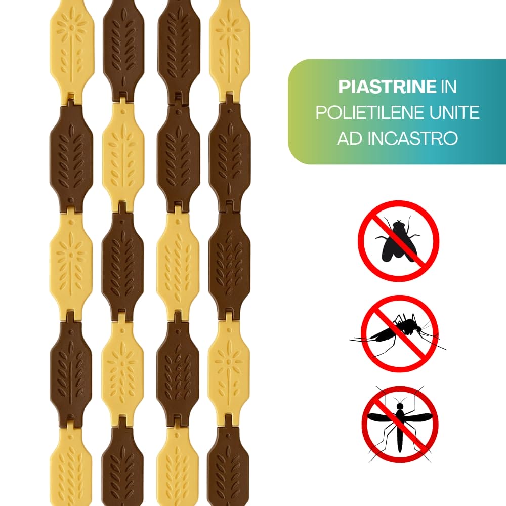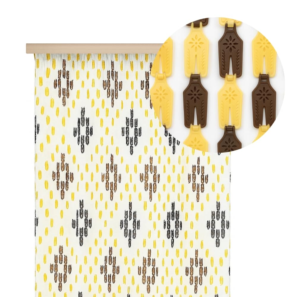 Tenda a piastrine di colore Marrone e Giallo con trama a rombi, misura pari a 120x230cm, ideale per decorare la tua finestra o porta proteggendo la tua abitazione da mosche, zanzare ed insetti. Utilizza la nostra tenda nei mesi più caldi così da poter lasciar passare l'aria proteggendo allo stesso tempo la tua privacy.