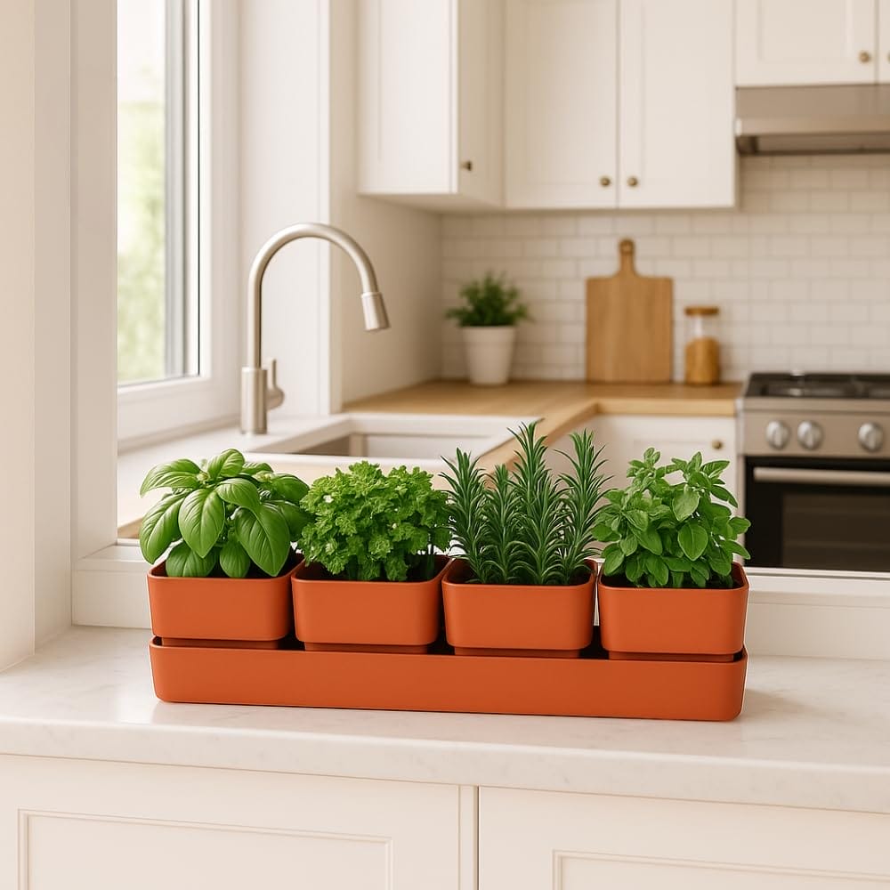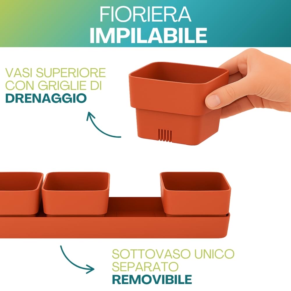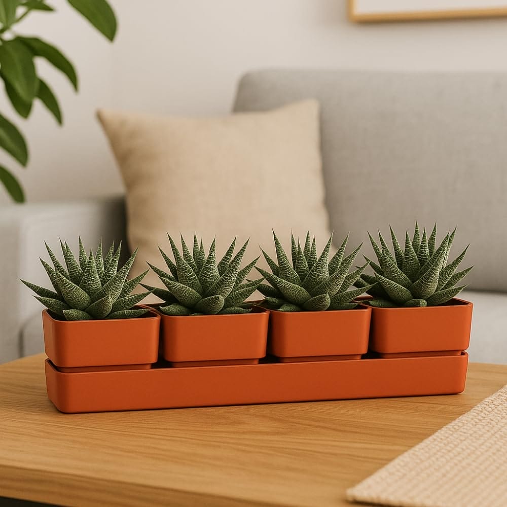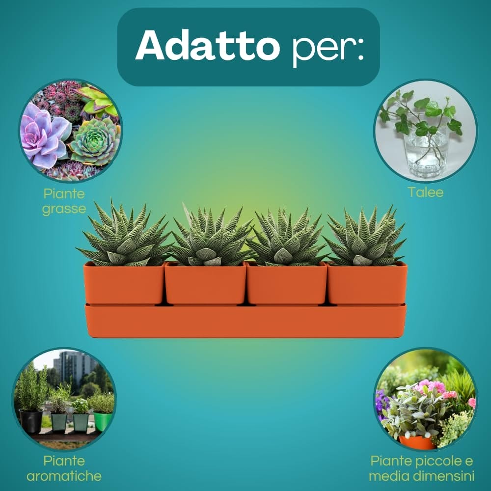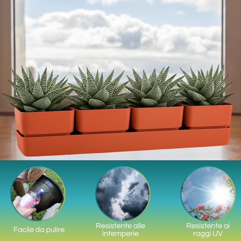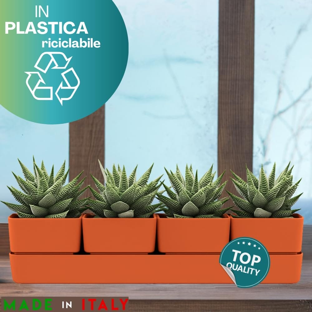 Fioriera rettangolare 48x12x11 cm formata da 4 vasi per fiori con 1 sottovaso resistente ai raggi UV - Colore Coral