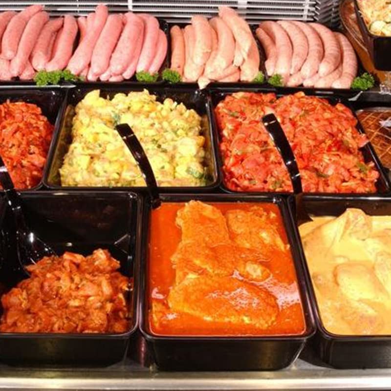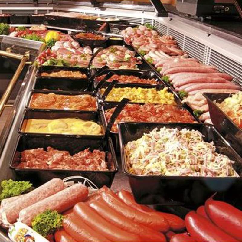 Vassoi da banco macelleria Vaschetta da banco quadrata mis. 22x22 cm Nero con bordo stondato Vassoio da esposizione per gastronomia, salumeria Formato A6 - Altezza 8,5 cm